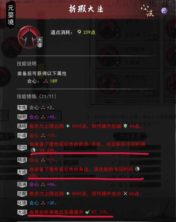 心法会心选的身法冷却,武技冷却,吸血效果提升,带攻防那肯定是最好的了,心法灵根选的血刃持续时间,血刃叠加层数,血刃增伤,心法功法选的攻防暴体,但是最理想的是选剑的功法词缀选攻防,使用身法武技冷却减少,身法持续时间增加可惜我没刷出来,剩下的体,灵,念还没刷到好的就不贴出来了,理想最好是杀精英回血回灵,低血量低灵力回血回蓝吧。