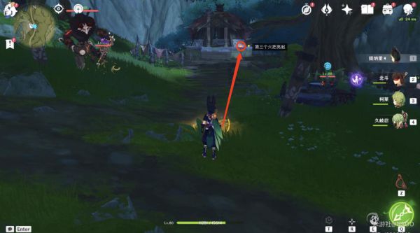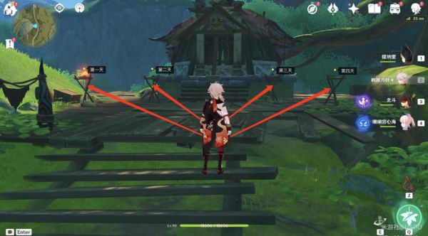 左起第二个火把亮起,击杀营地内的丘丘人守卫。