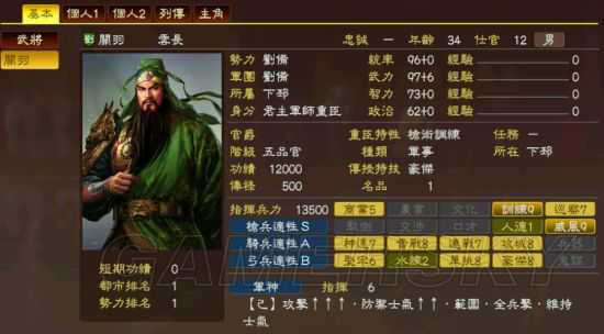 再来看一个商业5的大佬,这位大佬与上面的士族商家不同,他是靠卖绿豆卖到的商业5,没错,他就是关羽!他的三弟卖猪肉,商业居然是0,他的大哥卖凉席,商业居然也是0!所以,由此可见,光荣的人物特技设定是这样的,换而言之,我们在调整自建人物的特技时是可以这样考虑的。