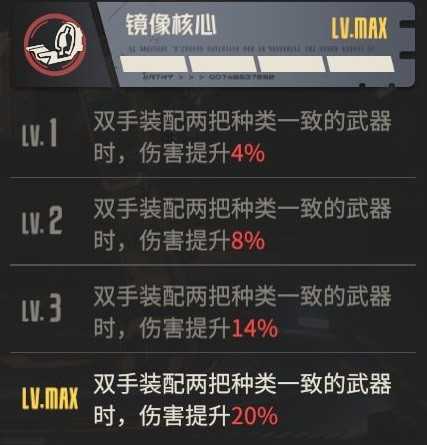 “镜像核心”,稳定增伤20%。考虑到洛莎的天赋和技能,她驾驶的机兵必定是双手装备机枪的,所以这20%的伤害提升肯定是稳定的。而且,等到洛莎的电磁炮技能陆续解锁,这个20%的伤害提升也会加在电磁炮上。