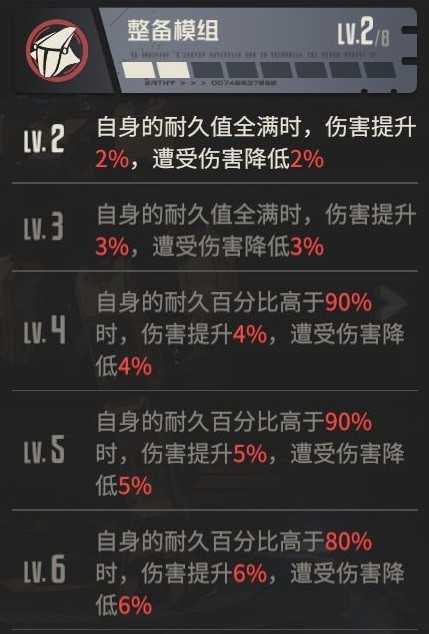 “整备模组”,在自身高耐久或者耐久全满时能获得增伤效果。这种增伤效果在有机械师每回合提前修理,或者是在洛莎使用完“一人成军”这种自带回血的攻击技能后都能达成。当然了,如果洛莎后续一些有关电磁炮的技能或者被动解锁,她可以远程提供大量伤害支援的话,还是能稳定自身血量保持增伤的。