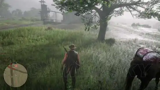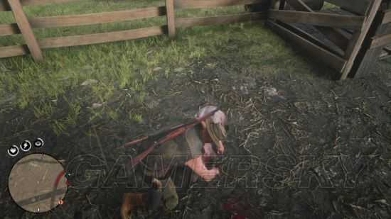 过来不远有一个任务点并且有一个猪圈(有中国大猪),这里猪全部杀死剥皮,再拿个完美尸体让马驼着,14个猪腰肉可以留着自己吃也可以一起卖掉(能卖接近10美元)这边人烟稀少就算白天几乎也不会被发现报警,如果发现了果断用步枪搞死,不用担心掉的那点荣誉,刷刷马就回来了。猪圈前边的树那里有很多能做菜+buff的植物记得采摘