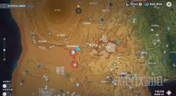 新地图千壑沙地位于须弥沙漠地区的上方。传送到饱饮之丘右上方传送锚点,然后跑到七天神像位置与七天神像互动即可开启千壑沙地区域地图。