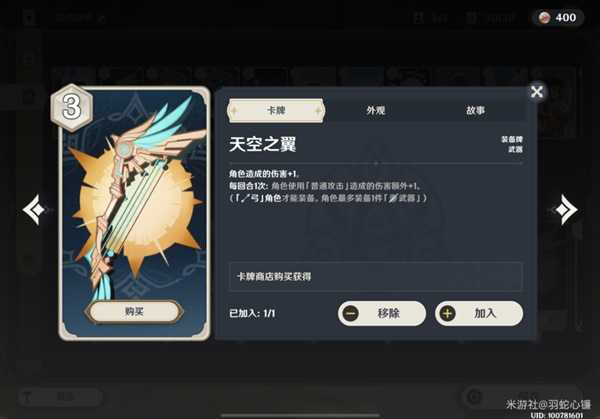 三种弓箭武器依据个人喜好总共带两至三张即可,各有优势,霜华矢属于普攻可以吃满「天空之翼」的加成;「祭礼弓」可以提高骰子的使用效率,毕竟甘雨非常吃骰子;「鸦羽弓」费用低成型快。武器总数稍微多带点提高出货率即可,其余角色不必准备武器。