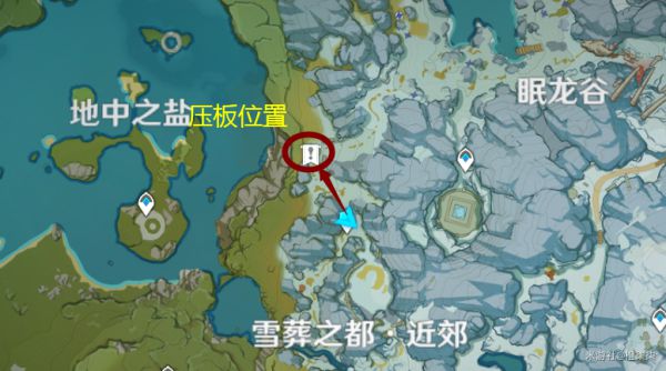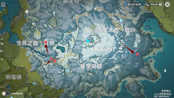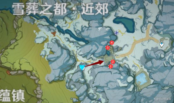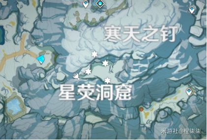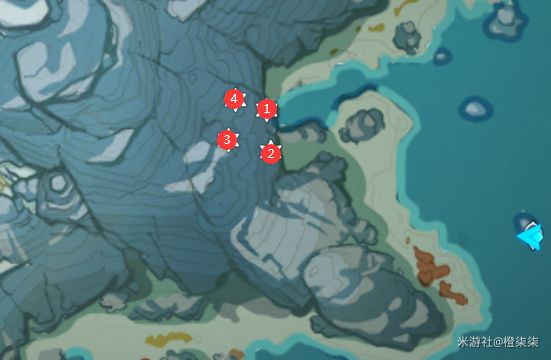 四个机关具体位置如下,有一个机关需要使用深赤之石来破坚冰才可以看见,机关标记是星星,深赤之石标记为鸡腿。