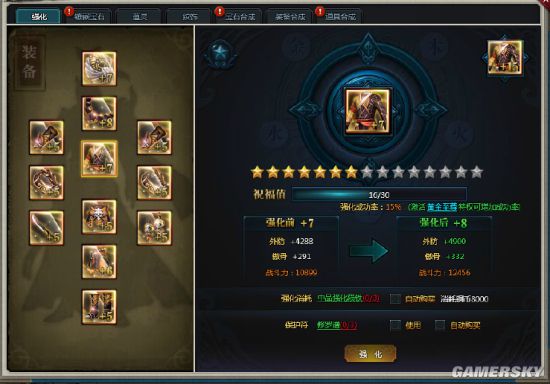 二、玩家通过使用强化陨铁,可以强化装备,装备强化等级越高,所加成的人物角色属性越高;装备强化等级越高,强化成功率越低,装备强化+5后,再强化需要使用保护符防止强化失败强化下降。