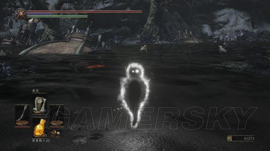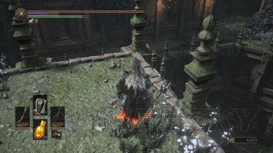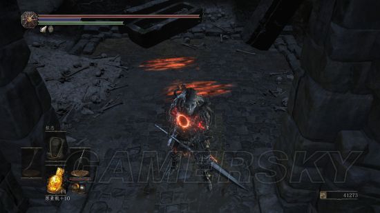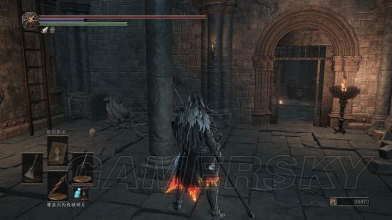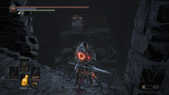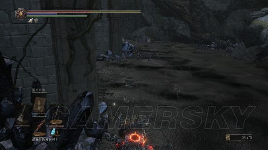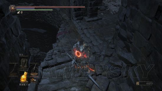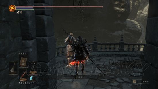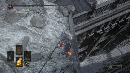 其实上了梯子有2个骑士,可一个会王之军势的巨人不要理(死亡),然后下一个台阶找到上图,但是很有可能什么都没看见就跳了下去,我第一次也没看见楼梯导致浪费了1分钟的生命。