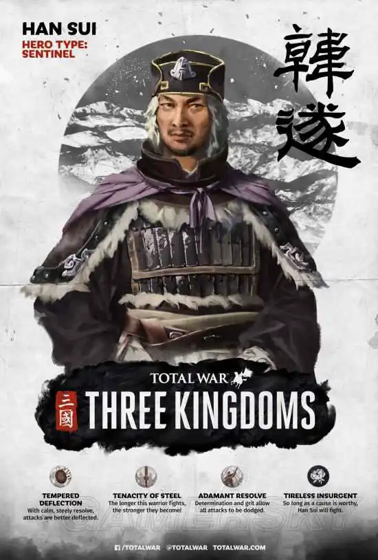 《三国全面战争》公布了韩遂的人设图及其技能,韩遂在历史上与马氏一族有着错综复杂的关系,那么在游戏中两大势力又将擦出怎样的火花呢?下面小编带来了《三国全面战争》韩遂人设图与技能翻译,一起来看看吧。
