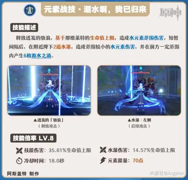 ①元素爆发分为两段攻击,第一段是施放攻击、第二段是降下2道水瀑,造成弱水元素伤害,二者共享常规附着规则。