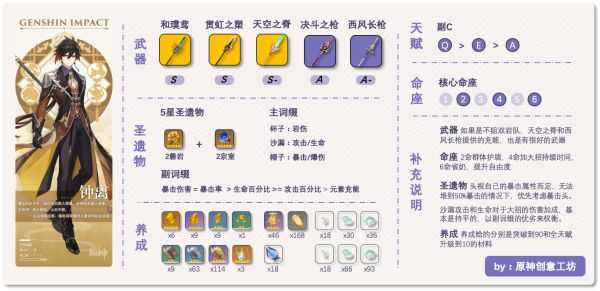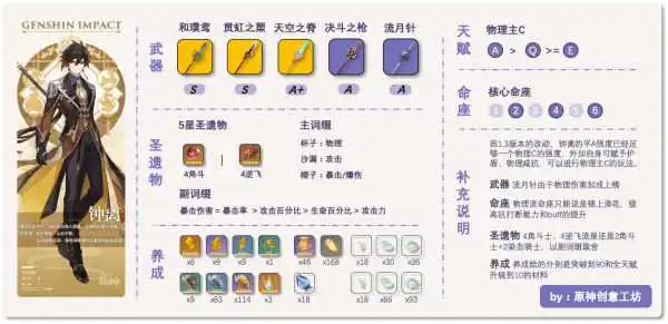 和璞鸢、贯虹之槊、决斗枪都是适合钟离的装备,物理C可以多考虑一手流月针,如果是不组双岩队,天空之脊和西风的充能,也是有价值的武器。