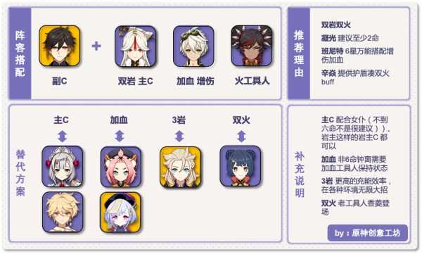钟离组成双岩,可以提升充能效率,配合女仆(不到六命不是很建议)、凝光(建议2命以上)、岩主这样的岩主,配合护盾的减抗和双岩的增伤、减抗,可以提升岩队整体的强度。岩王帝君1.3版本终归位。