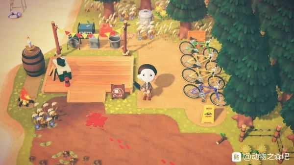 用了许多营地一般会用到的物品装饰,例如水桶,垃圾桶,野草,自行车,树枝等。
