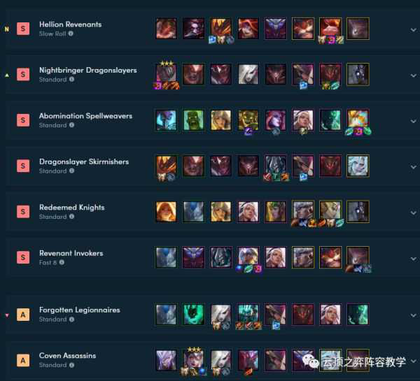这个阵容目前在高分段比较火,适合大师王者局,相信过两天在低分段也会火的,大家可以拿着这套阵容赶紧上个大分吧。下面是目前玩的比较多的阵容,大家可以参照一下。