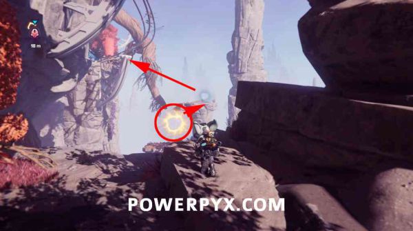 在地图西北方的边缘地带,有一个移动平台在不断绕圈飞行。追上这个平台,靠近它时按【L1键】跳上平台,踩下平台上的压力板,它就会停止移动,平台上的橙色保护罩也会消失。激活祭坛即可找到隆球。