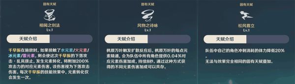 【风物之诗咏】万叶自身的元素精通转换为扩散反应的元素加成,且可多种加成共存;每100点元素进攻明晚也就可以提供给队伍4%元素加成,在500元素精通时为20%,在800精通时为32%。由于万叶等级突破时加元素精通,让他成为一个拥有32%元素加成的辅C难度并不是很大。