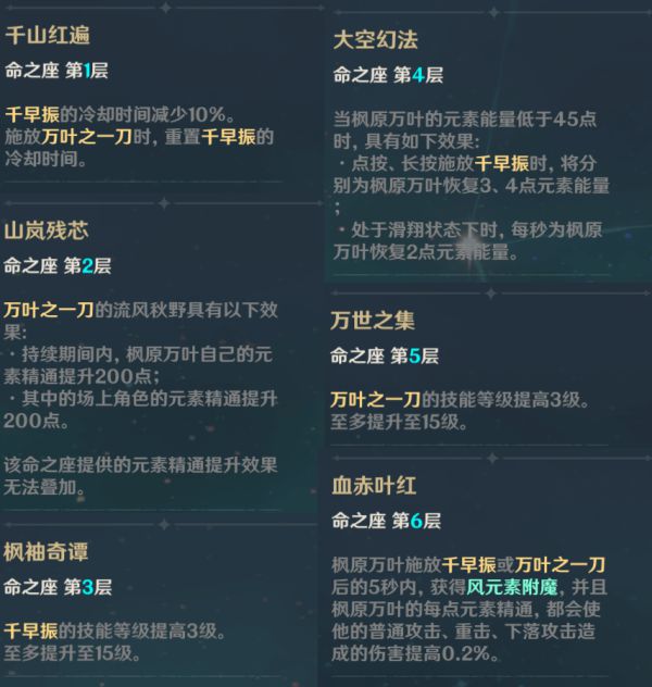 1命万叶,略减少元素战技冷却时间,释放元素爆发后可以重置元素战技,能较好的缓解后续元素充能的压力;在队伍中存在双风角色和2命重云时能给予万叶元素战技30%的冷却缩减。