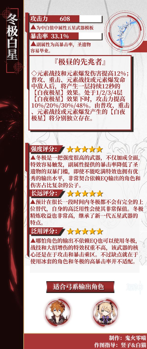 本期带来的是神铸赋形UP武器【冬极白星】的专项测评,我将分析弓系角色与这把武器的适用性,利用数据计算对比当前主流弓系武器的收益,对它的强度作出评价。图片制作&文案:鬼火零喵