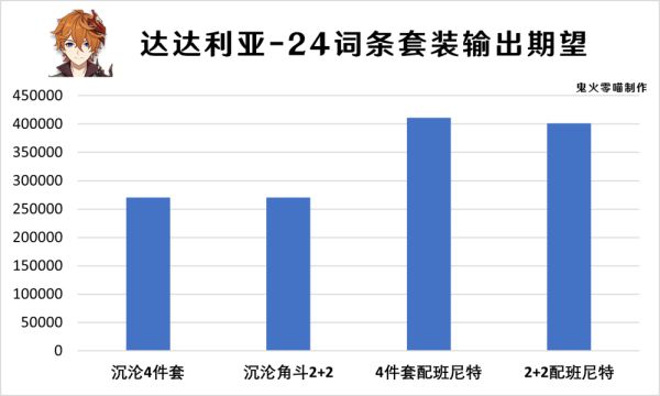附「公子」的一轮循环(12秒)伤害期望对比,首先数据证明【冬极】更适合与【沉沦】4搭配,但即使是算入了「班尼特」,【沉沦】4与2+2的伤害差距依然微乎其微,建议哪套词缀好选哪套。这里模拟了简单一点的手法:开E → A一次挂上【断流】→ 开大 → 使用6次AA重击循环,【断流·斩】触发7次,其中开E伤害、第一次平A、大招的第一段默认吃到蒸发,其他伤害虽然可通过操作提高蒸发率,但均不算入稳定的反应。