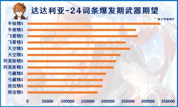 第二张武器对比图输出手法和蒸发与上述相同,但辅助只考虑双火共鸣,从图中我们可以看出「公子」使用【冬极】的伤害期望在同精炼五星武器中最高,而且精炼收益很夸张。【冬极】圣遗物使用【沉沦】4,而其他武器的圣遗物为2+2。【飞雷】吃亏的地方在于武器第二特效只能加成普攻,而且权重比较高,公子的重击、断流和大招伤害占比也很多,尤其是大招考虑了蒸发的情况。综上,可以认为【冬极】就是当前最适合「公子」使用的武器。