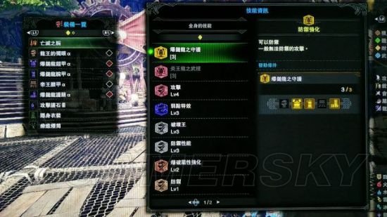 第二套适合需要防强的怪,或者觉得跑不开防强才能防的技能时用的,配装时考虑的技能优先级是防强,防3,弱点特效,攻击4,最后配出来搭一颗破坏王有破坏王3,还是需要一颗送的攻击珠。