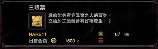 任务中需要我们狩猎1只天地煌啼龙。三眼票的用途是在加工房生产外观装备【内衣 α 】服装和【内衣 β 】服装。