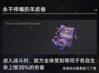 越早拿越香,有了他推图贼快,并且40%的伤害提高也使得在打首领时容错更高;另外永不停嘴的羊皮卷,如图