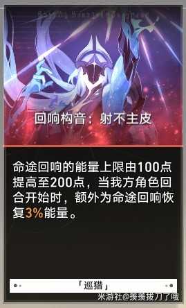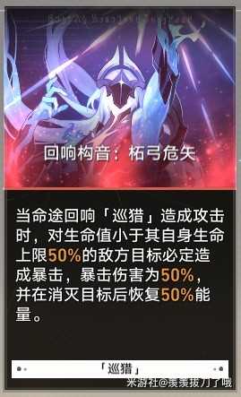 我的打法就是输出基本靠命途回响,只要有正常主c,巡猎的回响伤害很可观,特别是在拿到回响构音:柘弓危矢