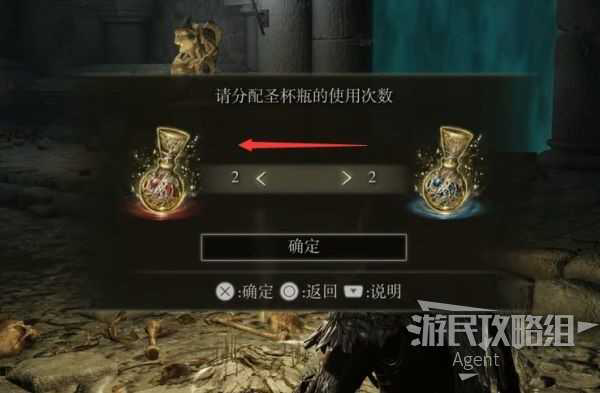 在赐福休息时,建议分配圣杯瓶的使用次数,尤其是新入坑的萌新,为避免走几步就挂掉,最好都调成血瓶,这样你就可以拥有4次补血机会了。