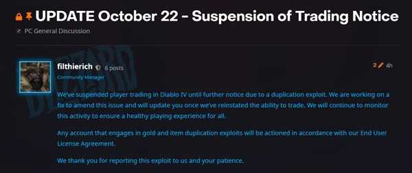 由于复制漏洞,我们已暂停《暗黑破坏神 IV》中的玩家交易功能,目前正在努力解决该问题,恢复时间将另行通知。