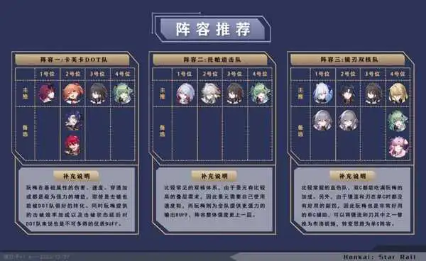 另外由于阮梅的击破状态延后效果对DOT队有特殊的功能,所以阵容一般也分为DOT体系和直伤体系两种。根据不同的打法和构筑思路,阮梅的配队类型可以大致分为卡芙卡DOT队、托帕追击队、双核直伤队。