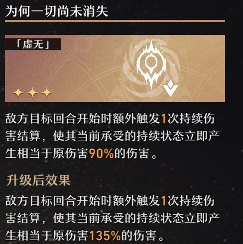 这是第三个核心BUFF,角色每次普攻造成伤害,都能触发一次【虚无】命途回想带来的持续伤害效果,比如奶妈普攻一下本体伤害300,那么后续跟随的伤害可能来到了2000甚至3000往上,可以说这个BUFF配合【巡猎】大招提供100%行动条,可以在原本的伤害上再提升了30%以上的输出效果,并且能很好的触发第一个核心,造成伤害后提供一层【怀疑】BUFF。