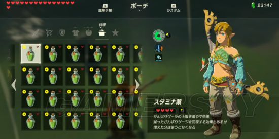 很显然,即使是三大条耐力,也是飞不了数千米之远的,林克必须在空中补充耐力,所以你需要提前准备很多耐力药。最合适的是能一口气恢复所有耐力并暂时提高上限的那种耐力药。使用「ガッツ/Enduring」词缀的材料就可以制作,建议提前备上一版。