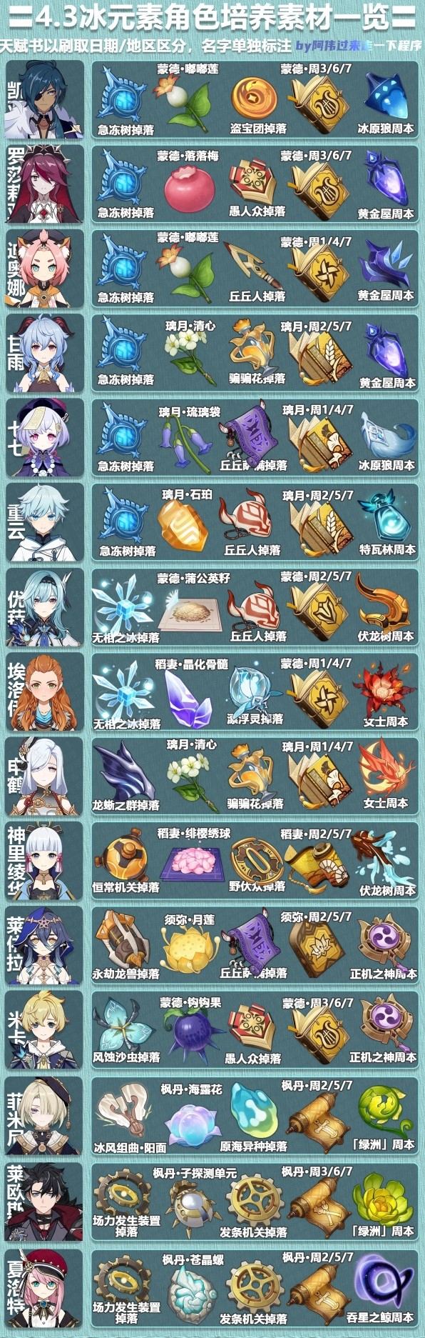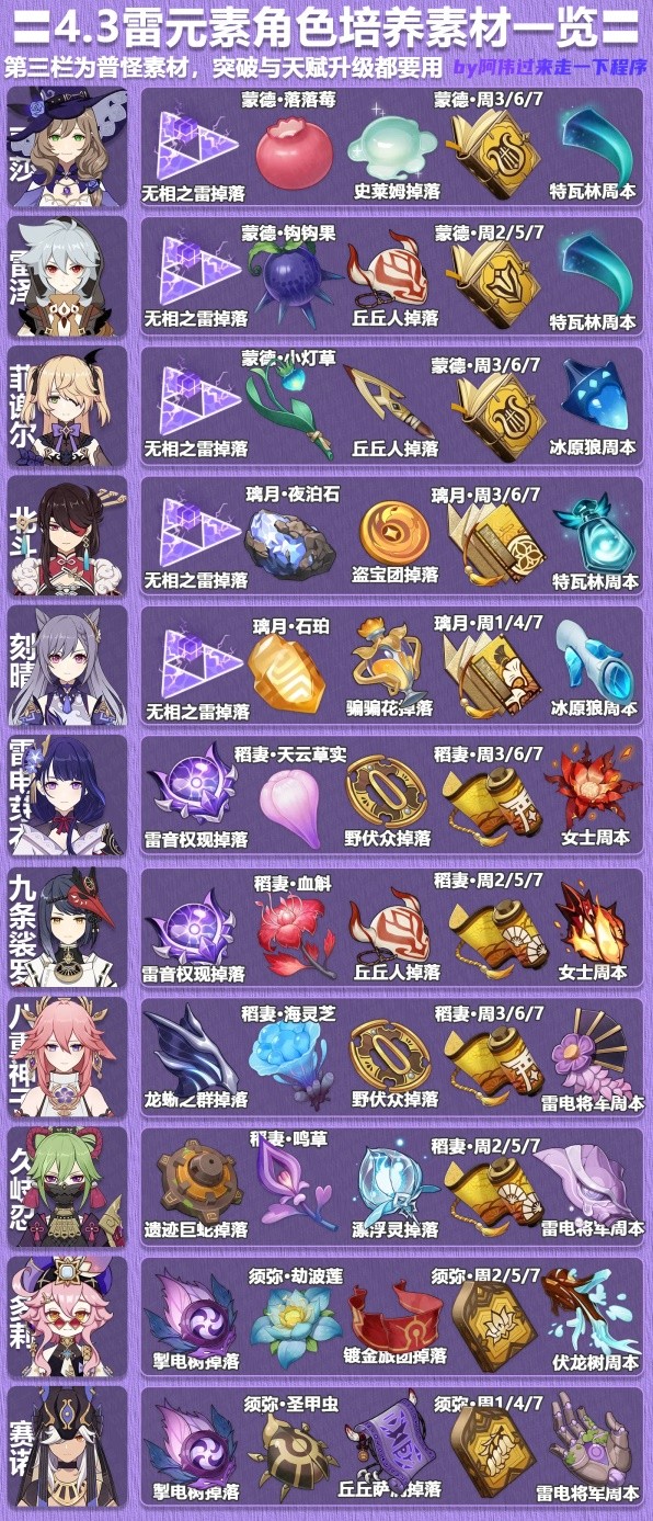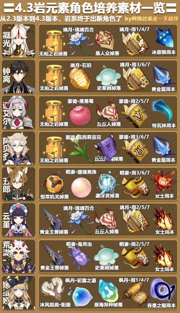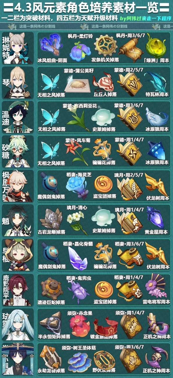 正文 2025年《原神》4.3全角色材料需求表「超实用」 快乐小编 /2025-09-19 08:58:08 /15 浏览量 0919 《原神》随着版本更新已经拥有了大量的角色,那么目前全部角色的培养素材需要哪些呢,下面请看“阿伟过来走一下程序”带来的《原神》4.3全角色材料需求表,希望能够帮助大家。 于是抚心定气,复见所梦。 -- 展开阅读全文 --