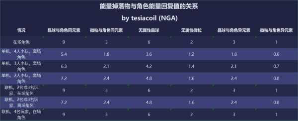 在角色拾取到能量掉落物时,在场角色和离场角色都能获得能量,但比例不同。同时,角色的能量回复值受角色元素属性和能量掉落物属性两方面的影响。