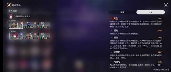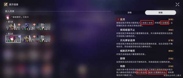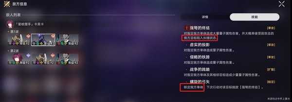 【言灵】是敌方卡芙卡的关键控制技能,如果我方陷入【言灵】状态,会攻击我方自己人,卡芙卡会触发追击【残酷】,其他技能就是会给我方施加触电的持续伤害状态;