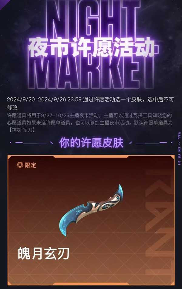 官方最新的夜市许愿活动中,玩家可以选择“兔子刀”魄月玄刃作为许愿皮肤,这意味着本期国服夜市将能够刷到魄月玄刃,国际服夜市奖池也将同步加入魄月玄刃。