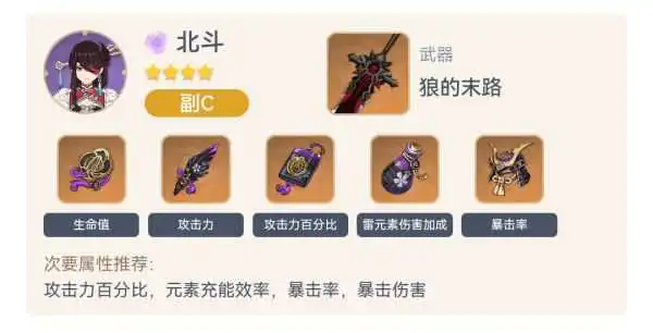 圣遗物首选【绝缘四件套】,由于北斗没有像满命行秋那样的能量回复手段,二雷二宗室未必有绝缘4好,按实际情况选择,雷伤杯。