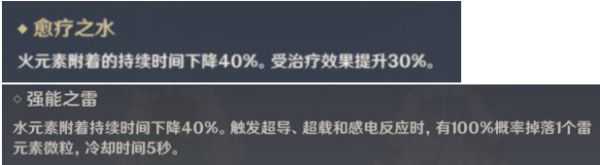 【匣里灭辰】的武器特效是对水元素附着敌人有伤害加成,由于水雷共存的关系,该阵容基本全程是水雷覆盖,可以一直吃满效果,而雷神独特的协战能力(后手上雷),元素精通也能提高感电反应伤害。