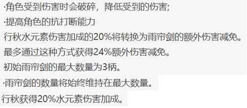 行秋在大招期间会提高抗打断能力,并全程获得伤害减免,减伤比例基础最高29%,理论总共29%+(46.6+15+20)*20%=45.32%,非常恐怖。雨帘剑碎裂或者结束可以为场上角色回复最少24%生命值。