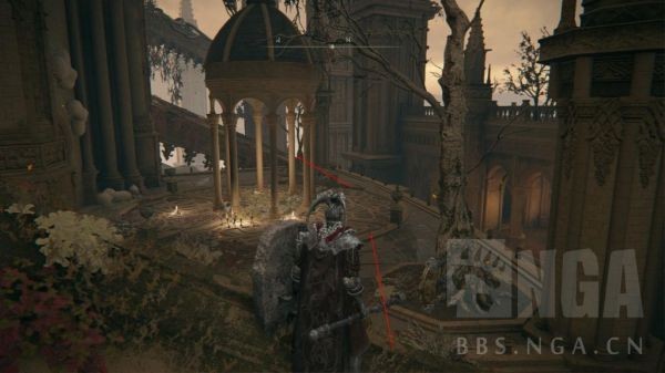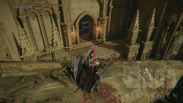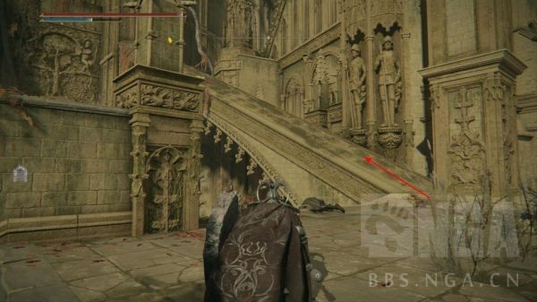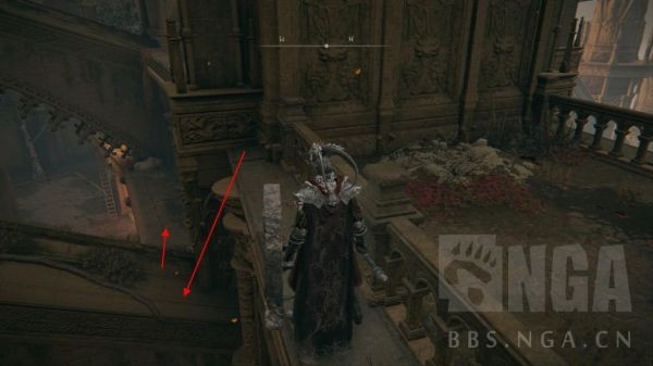 上楼梯后干掉弩炮和圣树士兵骨灰[旁的小兵(共3只)走斜面,这里右边是圣树士兵的骨灰,左边跳下去就算黄金树化身+双弩炮+双圣树骑士了
