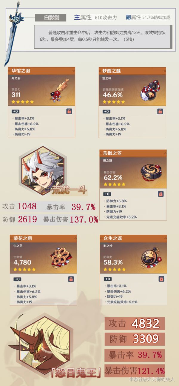 1. 荒泷一斗,5精白影剑,「华馆」4件套毕业面板: