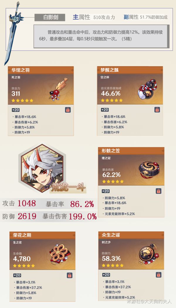 最后,荒泷一斗的毕业面板圣遗物的副属性不一定完全追求,70%也可以。