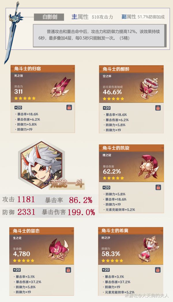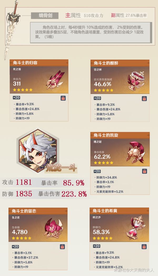 6. 荒泷一斗,1精赤角石溃杵,「角斗士」4件套毕业面板: