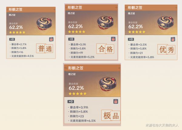 圣遗物的副属性可以分成普通,合格,优秀,极品4个等级,极品圣遗物副属性的数值比 合格 高25%。