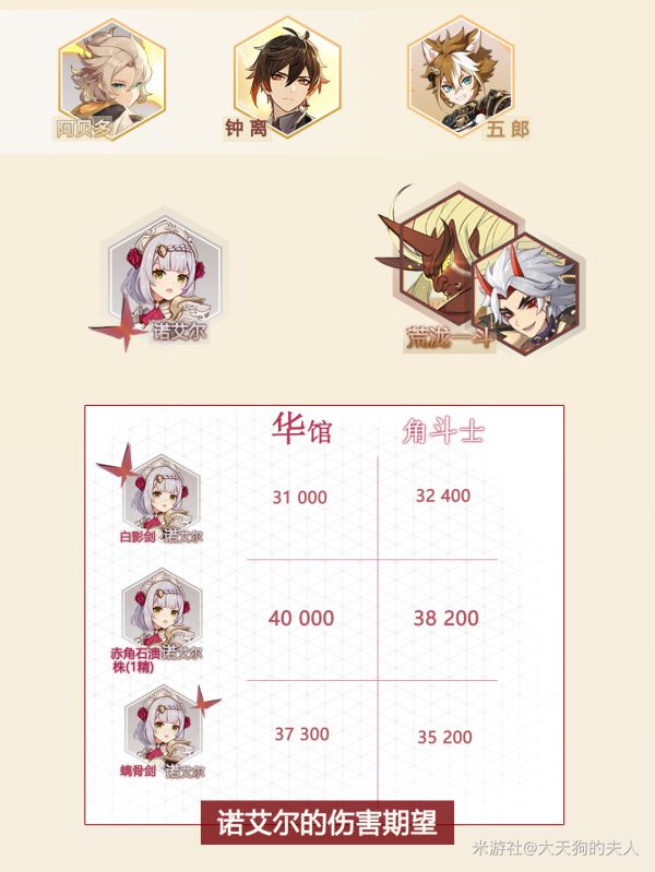 一斗使用元素爆发,有2秒钟动画,不会造成伤害;诺艾尔使用元素爆发时会有挥刀伤害;一斗使用元素战技时能造成高额伤害;诺艾尔护盾破碎时能造成高额伤害;他们砍刀的次数和频率;他们的冷却时间,战场时间,队友辅助的时间...