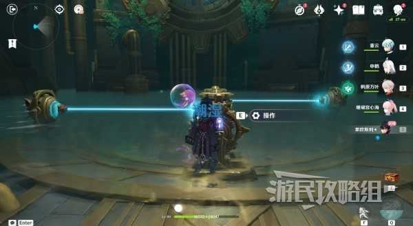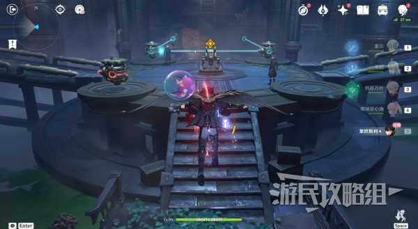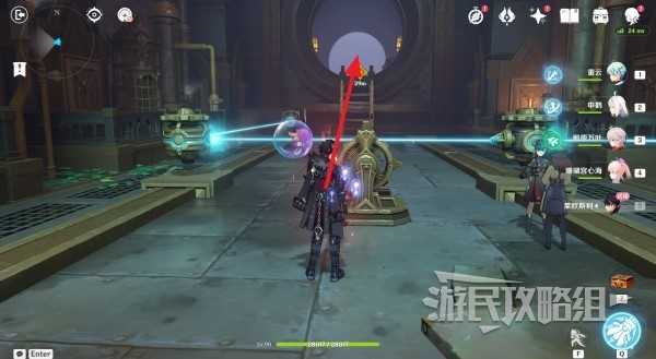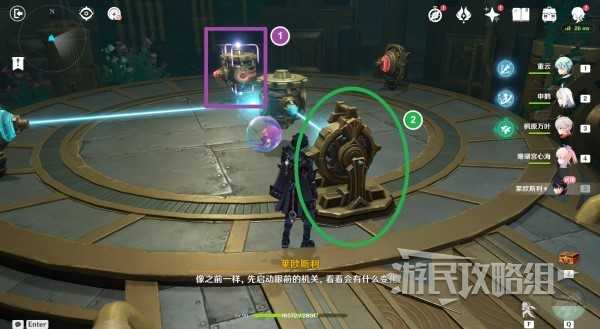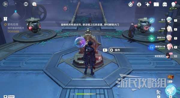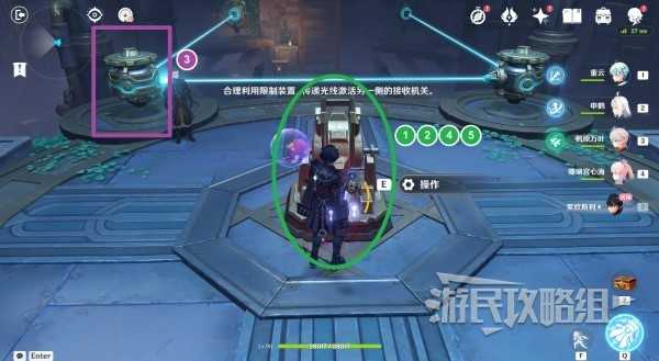 站在旋转机关处,可以看到前方有一个被粉色光线框住的装置,先将它的限制器取下,然后与旋转机关互动,旋转2次。
