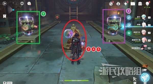 站在中间的转盘机关处,旋转2次转盘机关,然后靠近我们所在位置左前方的装置并为其安装限制器,然后返回中间的转盘机关处,再次旋转2次。
