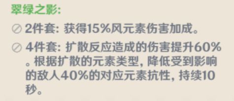 对于搭配“火水雷冰”这四种元素的输出角色来说,更多采用“翠绿之影(风套)4件”以此增加主C的输出效率;而如果想要提升温迪的元素爆发伤害,那么推荐选择“风套2宗室2”的组合。