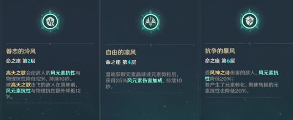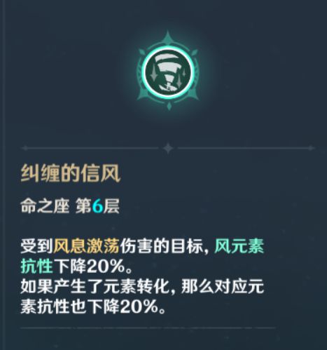 第6命座则是进一步削减风抗,而元素爆发发生元素转化之后会进一步削减对应抗性,此命座则是进一步通过削减抗性而增强自身阵容的输出能力。