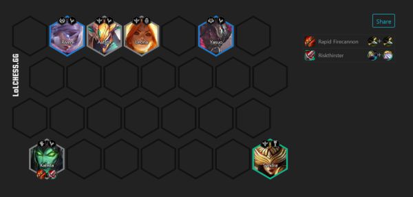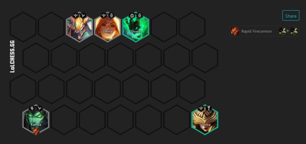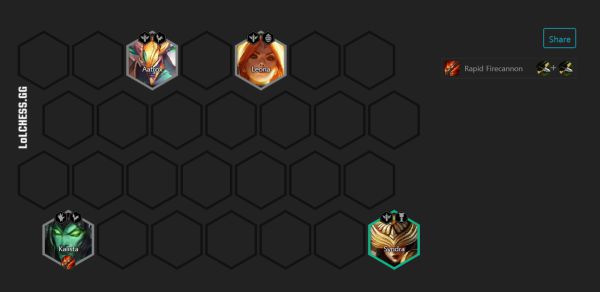 2-1拉4人口,4人口剑魔、日女、辛德拉、卡莉斯塔凑出3圣光2征战羁绊,前期卡莉斯塔拿来打工,只要有火炮或者分裂弓就非常强,法强小件给辛德拉,肉装给日女。